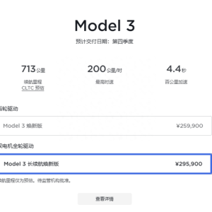 动力方面,新款Model 3标准续航版采用后轮驱动,最大功率194千瓦,峰值扭矩340牛·米,0-100公里/小时加速时间为6.1秒;长续航版采用四轮驱动,最大功率331千瓦,峰值扭矩559牛·米,0-100公里/小时加速时间4.4秒。作为对比,新款Model 3标准续航版动力不变,而长续航版最大功率下调26千瓦,峰值扭矩下调100牛·米,而新款Model 3的最高车速也分别由225公里/小时和261公里/小时下调至200公里/小时。
