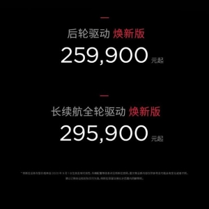 新车是一共推出了两款车型,分别为后轮驱动焕新版和全轮驱动焕新版,售价分别为25.99万元和29.59万元。