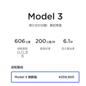 此次Model 3共推出两个版本,其中后轮驱动焕新版售价为25.99万元,而双电机全轮驱动长续航焕新版售价则为29.59元。