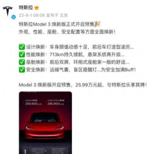 9月1日,特斯拉宣布,Model 3焕新版在国内开启预售,其中后轮驱动焕新版起售价为25.99万元,长续航全轮驱动焕新版起售价为29.59万元。